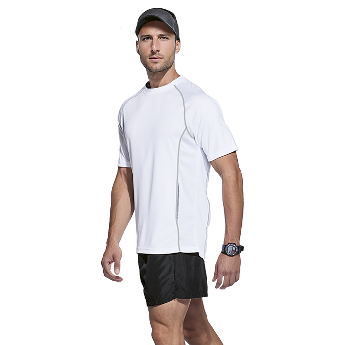 130g 100% Polyester drop-stitch knit, moisture management fabric: e-Dri, Raglan sleeves, Contrast cover-seam stitching on panel seams, Back neck reflective tape loop, Tonal mesh side panels with reflective flat piping