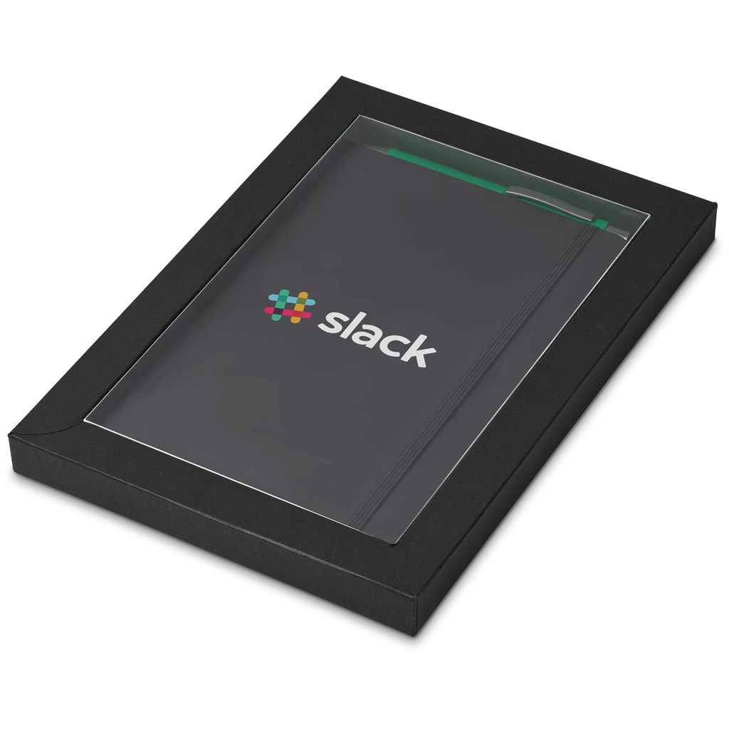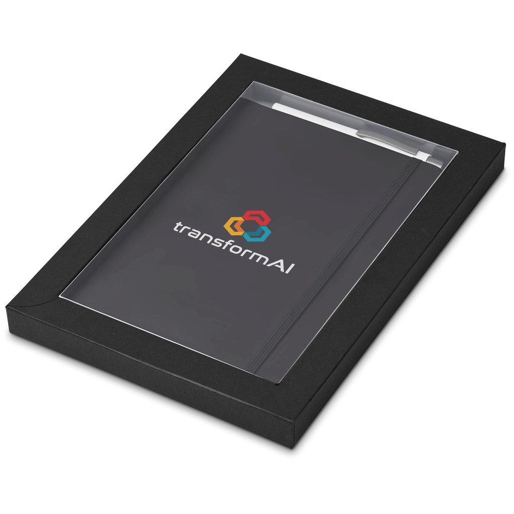 A black Omega A5 Hard Cover Notebook and an Omega Ball Pen in your choice of colour are packaged together in a box which provides bright and clear exposure for your branding. The box has a firm cardboard base, and a transparent acetate lid.