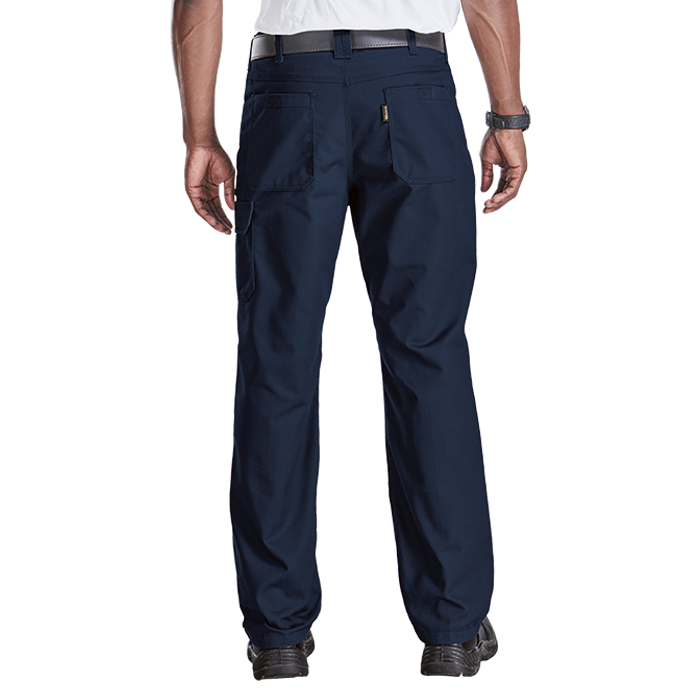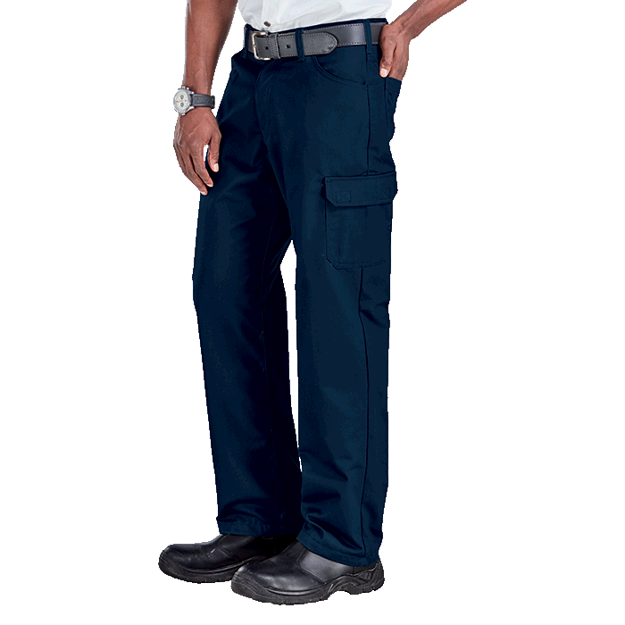 Front fly with metal zip and shank, A single patch pocket with flap and cell phone side pocket, LOCAL, 240g Poly Cotton twill fabric, Curved pockets with a money pocket, Constructed waistband with belt-loops, Tripple needle sticthing on back rise and inner leg, Proudly South African, Back patch pockets and back yoke