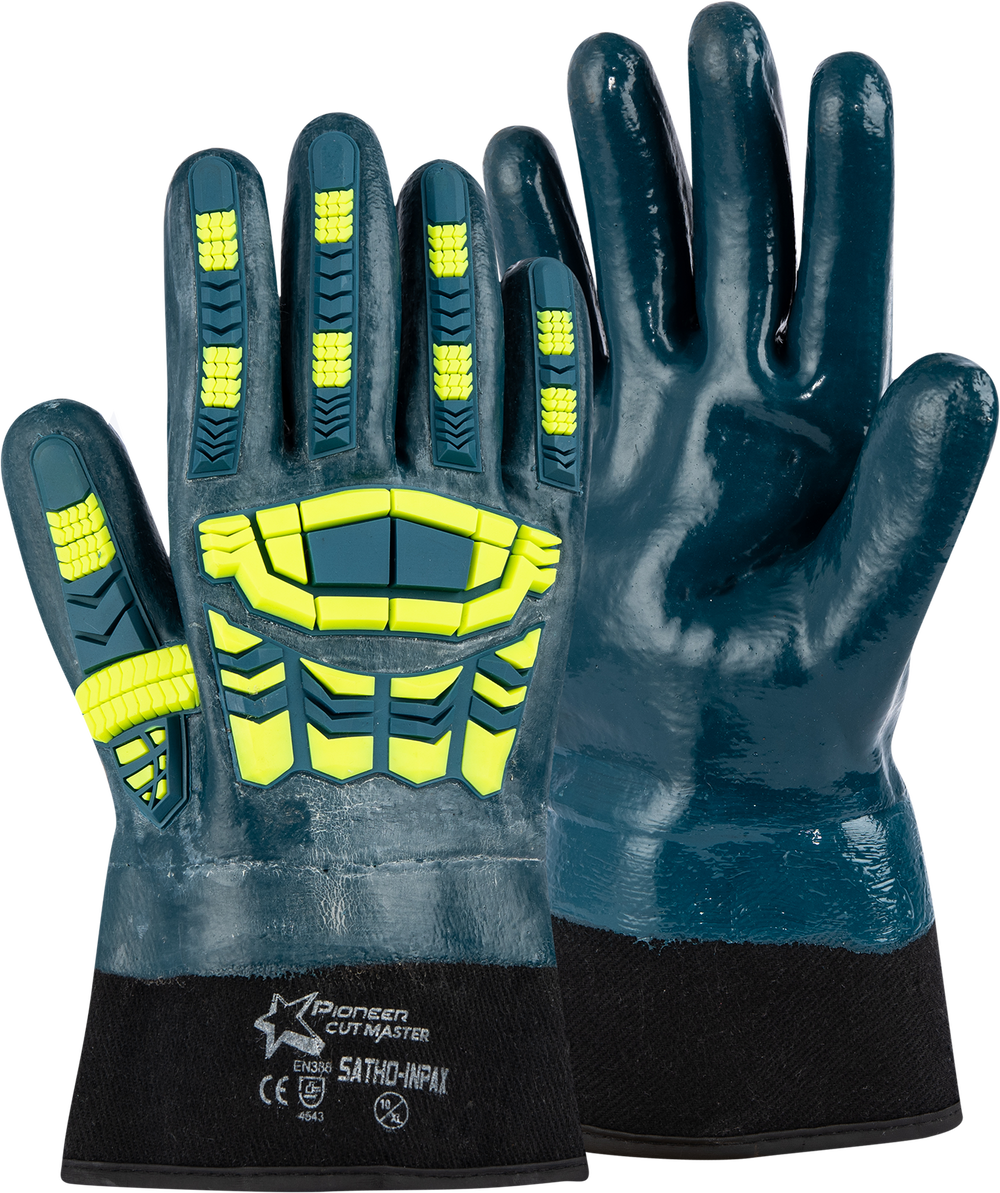 13 Gauge pepper HPPE cut Lv 5,fully coated blue Nitrile smooth,black Nitrile. Compound safety cuff,back and 5 fingers compacted TPR.