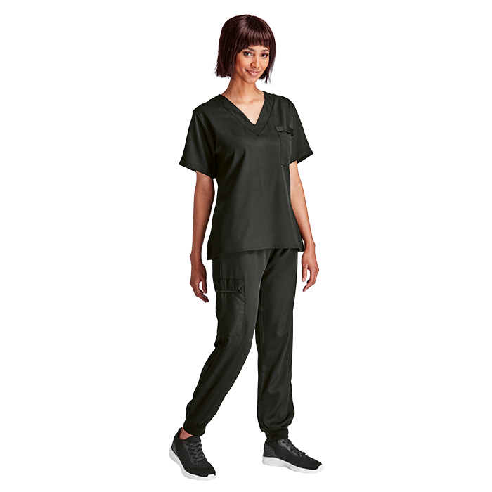 Set in short sleeves, Front V-shaped neckline, Front yoke panel, Elasticed waistband, Cuffs at hem, LOCAL, Front chest patch pocket and pen holders, Right leg patch pocket with zipper, 180g 4 Way Stretch Polyester